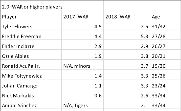 So, let’s focus on the six guys on the bottom of the chart, the guys who weren’t significant contributors in 2017. As you can see by the ages, two of them were veterans who had bounce-back seasons (Markakis and Sánchez). The other four, however, were between the ages of 20 and 26. Young guys breaking out and transitioning from prospects into legit big-leaguers. Atlanta also had a couple of guys just below the 2.0 fWAR threshold I’ve set in 2018, Dansby Swanson and Sean Newcomb, who put up 1.9 and 1.6 fWAR, respectively. They were also 24 and 25 during 2018, which also puts them in that mould of prospects delivering on potential.