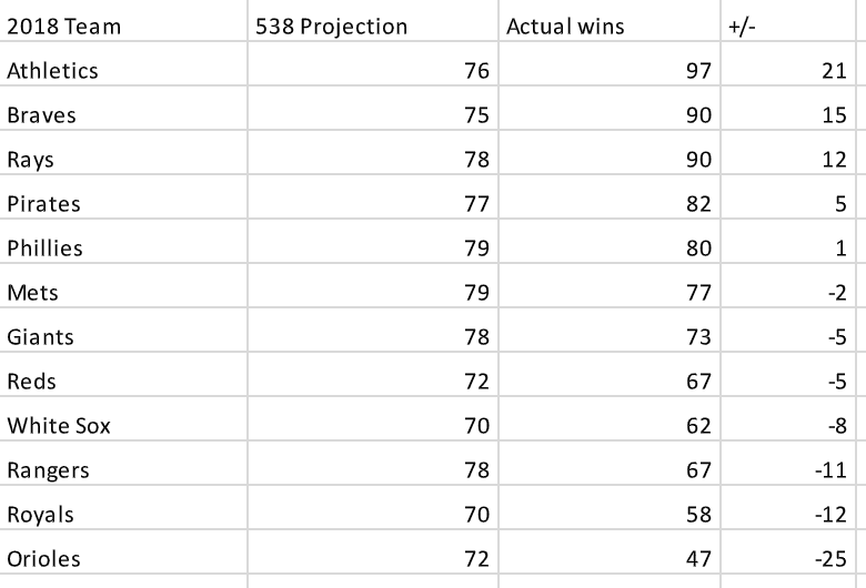 Is this a realistic thing to dream about? Let’s go back to those 538 projections for a second and compare them to how things actually ended up playing out in 2018. Since we’re talking about a Blue Jays team that’s going to be projected to win around 75 games, I’ll focus on the teams projected to have a win total in the 70s.