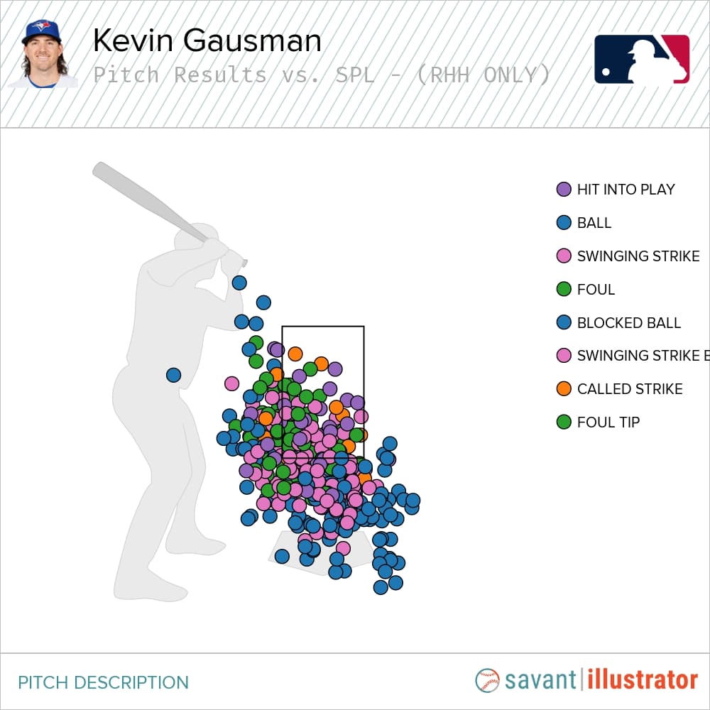 Gausman’s fastball gets hit hard by righties basically no matter where it is in the zone, but especially when it’s away. So then why is he throwing it in the zone more than any other pitch in baseball, as we mentioned before? Because if he didn’t, it would allow hitters to completely rule out one of his best two pitches. If he wasn’t a pitcher that threw in the zone often, the batter can pick whichever pitch they believe they can hit hard, and wait for Gausman to give it to them. This is because of the fact that they’ll be prepared not to chase, and Gausman can’t just walk everyone. However, his splitter is ineffective when thrown inside the zone, so he has to overcompensate by throwing the fastball for strikes.