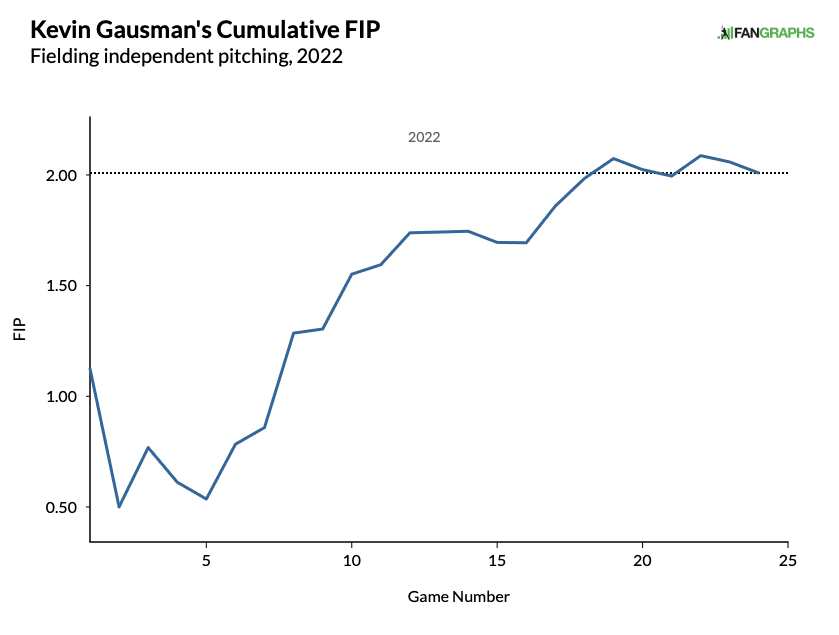 Kevin Gausman won no such Cy Young awards in his early days, though they can also be described as weird. While Pedro was working to move from really good to elite, Gausman was only hoping to remain consistently solid. He spent his first five years in Baltimore, where he was a good but not great pitcher. In his full odd-numbered seasons with Baltimore, his ERA was above 4.20. In each even-numbered one, it was below 3.70. Gausman seemingly couldn’t make up his mind as to how good he was.