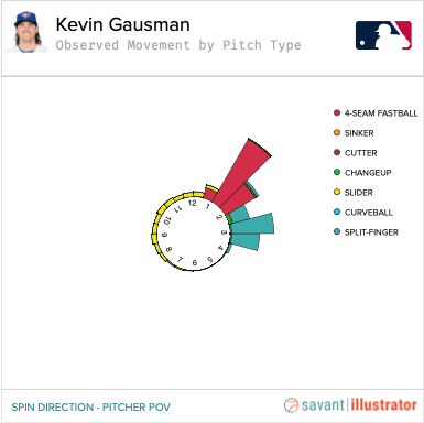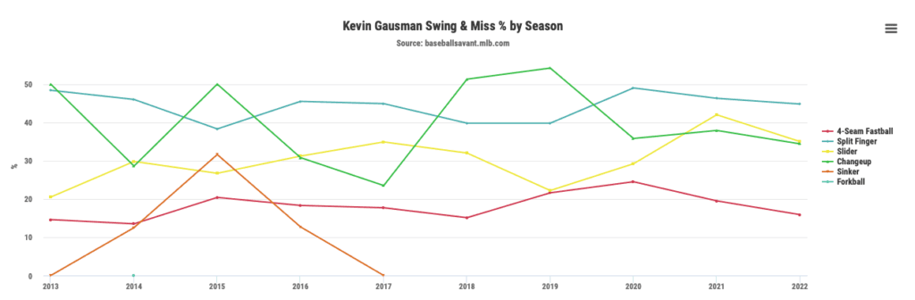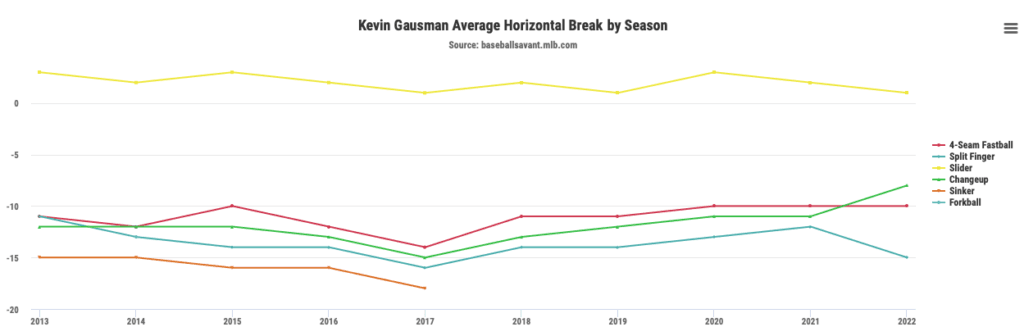 - Kevin Gausman 4SFB (2022) – 1055 pitches, -11 inches of horizontal movement, 13 inches of drop
