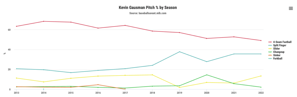 Interestingly enough, it took Pedro about 1100 Major League innings before he put it all together and had two of the best-pitched seasons ever. It took Kevin Gausman about 1100 Major League innings until he got to 2022. He’s now having the 8th best post-integration season by FIP-. He’s doing it on the back of, in Pedro Martinez fashion, one of the best-offspeed pitches in the league. So, that’s enough about Pedro for now. Let’s take a closer look at Kevin Gausman.