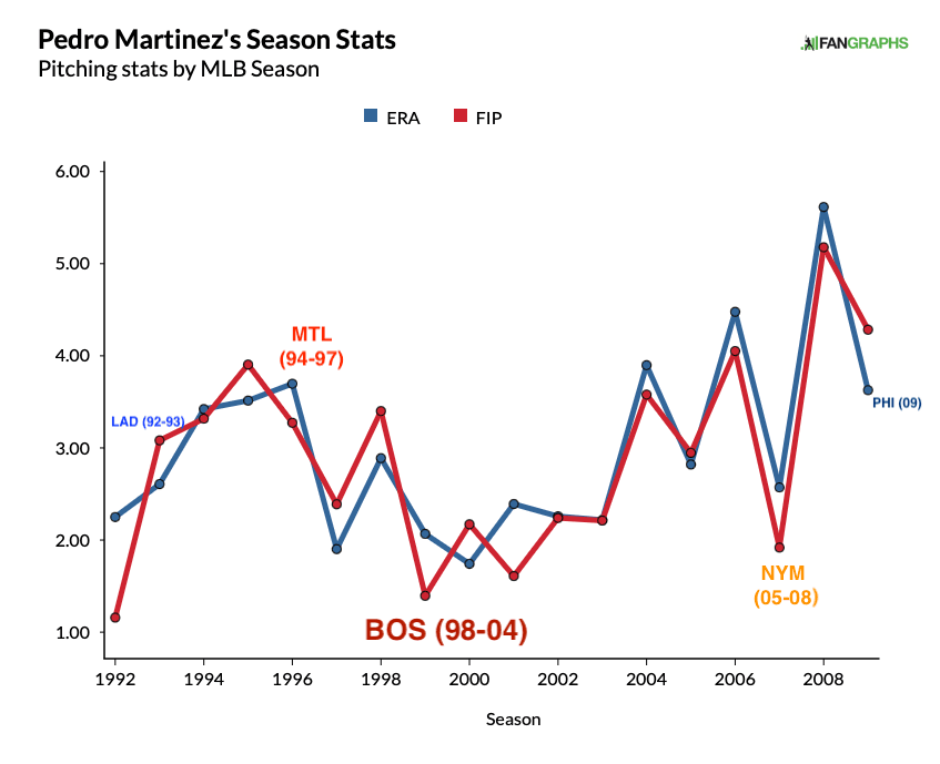 Martinez’s time in Montreal was best described as weird. He made his way to the team in 1994, and began to pitch his first great season, posting a 3.4 fWAR before his Expos and the rest of the league went on strike. The team was 74-40 at the time. However, the team would never make the playoffs again, at least not while they played in Quebec. Martinez came back in 1995, and was good… but not as good as the prior year. In 1996, he got back to his form from two years prior, and this time was able to pitch the whole season. However, Martinez’s 5.1 fWAR only ranked 13th. He was in dire need of a breakout, to truly cement himself as one of the best starting pitchers in the sport. He got one. In 1997, Martinez absolutely dazzled. His 1.90 ERA beat out all other starters in not only his National League, but the American League too. However, he was perhaps lucky to be pitching in the NL, as Roger Clemens put up a similar ERA, more wins, and more innings pitched for a different team north of the border. Clemens also had a better FIP, but it’s not as if any sportswriters at the time would have known. Anyways, it’s a moot point, because Martinez was in the NL, a league in which he handily took home the Cy Young award. In 1998, though, he’d be sharing not only a league with Clemens, but a division. A week after winning the NL’s Cy Young award, Martinez moved to Boston.