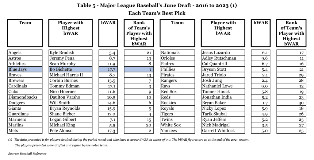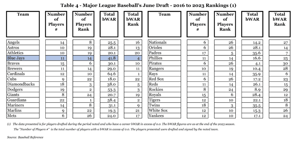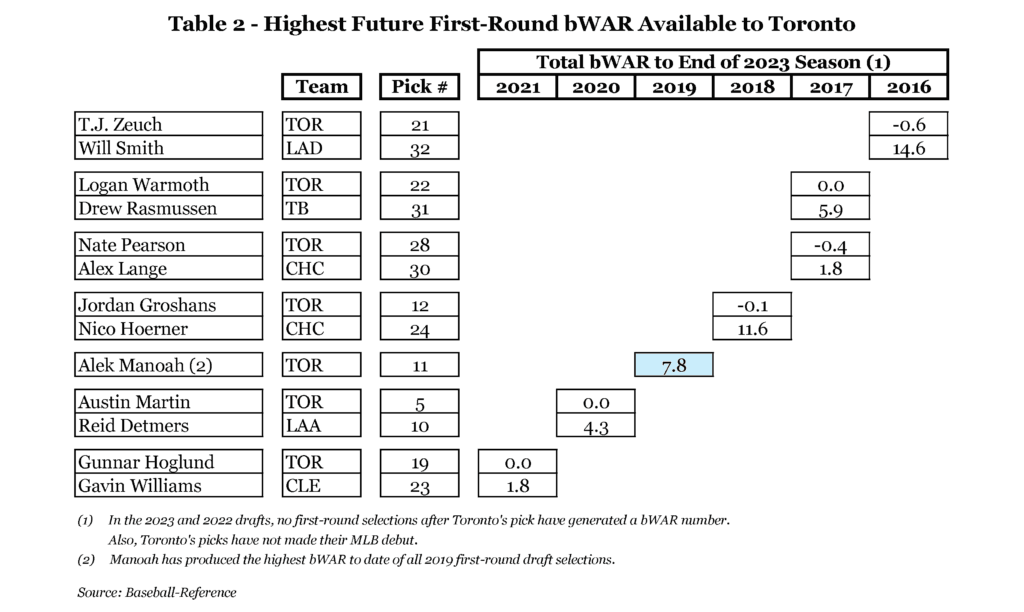 - Starting with the 2016 Draft, Toronto’s draft picks have generated the fourth-highest bWAR.