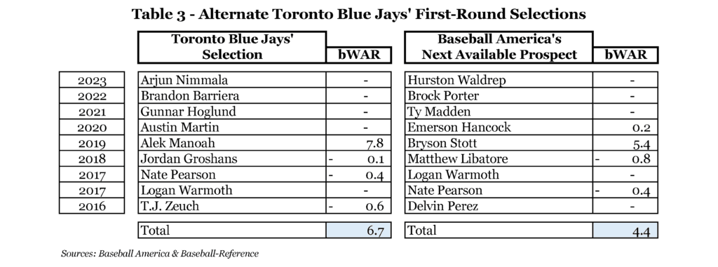 Let’s examine the first-round picks by the Atkins Regime in two ways. First, using perfect hindsight (highest bWAR to date), what available first-round selections should the Atkins Regime have made (Table 2)? Second, what would Toronto’s first-round picks look like if, instead of choosing the player they drafted when they drafted, the Blue Jays used Baseball America’s draft list to make their selection (Table 3)?