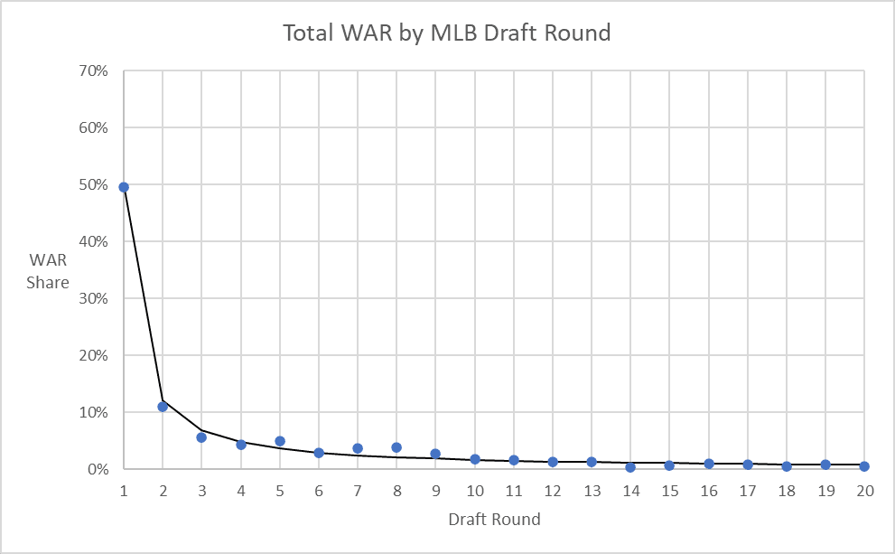 MLBAM’s Tom Tango produced an interesting chart, which I present below. Unfortunately, I could not retrieve a link to Tango’s post containing the chart. The data is from the MLB June Drafts for the years 2005-2015. As a % of total WAR produced by players drafted during the noted period, first-round selections accounted for 50% of total WAR. Expectedly, drafting success in the first round is important.