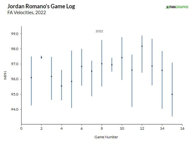 Nick Ashbourne wrote about the red flags in Romano’s game three weeks ago as he was dominating hitters in April. The velocity of Romano’s fastball is the biggest red flag of them all. At the time of Nick’s post, Romano was averaging 96.0 mph on his fastball, well below his season average from 2021.