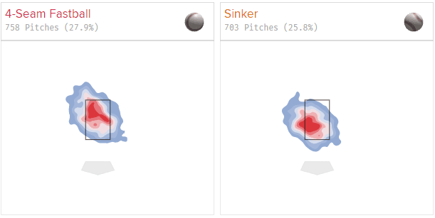 The four-seamer is the one that’s thrown at 95mph. You can probably tell the sinker has a little bit more movement but the point is both pitches have arm side run, with the same velocity and spin rate. The difference being Berríos has shown a little better location with the sinker last season…