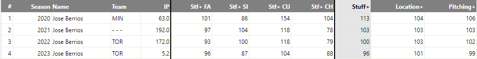 Part of the problem for Berríos, as mentioned in that Sawchik article from above, is that while Berríos’ stuff remains unchanged, it’s gotten worse relative to the league. FanGraphs has started hosting pitch modelling stats, developed by Eno Sarris and included in that is the stat Stuff+. And with that, we can see the decline in Berríos stuff over time…