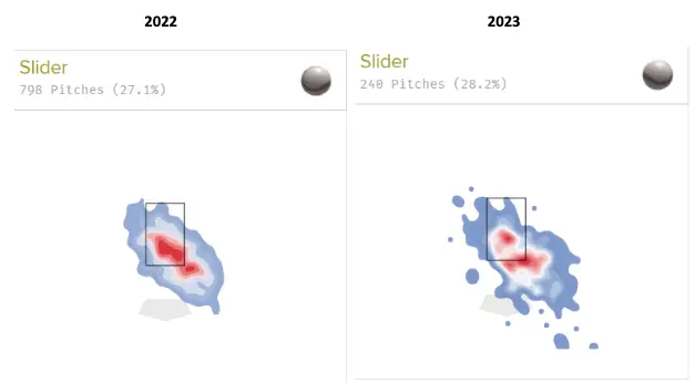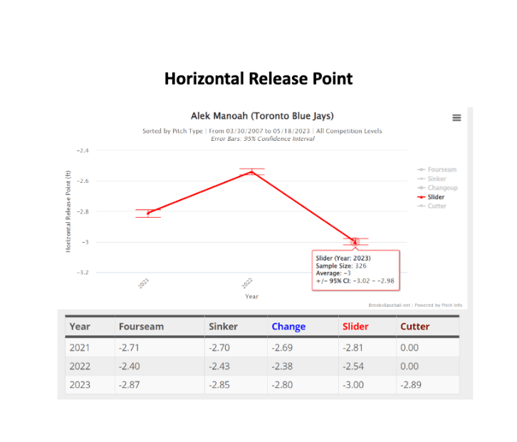 Manoah does have some interesting trends when it comes to his horizontal movement profiles. While I don’t have an exact measurement of how this would have a direct correlation to his on-field performance, having an inconsistent release point seems to be the case for Manoah, especially for his slider. His movement has only worsened since his debut, and his horizontal release point has changed a lot from even just last year. The slider is crucial to his success, as it is used often in pitcher’s count, as he hopes to get batters to swing and miss on it, however, that is also down, leading to an increase in walks.
