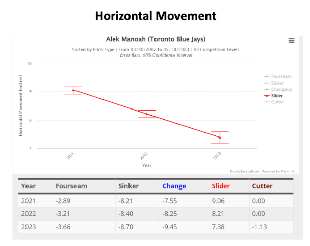 The main pitch that I care about for this analysis is Manoah’s slider. The slider is what has been pointed out the most as a pitch that has declined in quality. As his number one out pitch in 2022, it has faltered a bit in both velocity and movement. The problem with the slider is that instead of getting 6 inches of positive horizontal movement it only gets about 3.7 now. With less active spin, the quality of the pitch has diminished tremendously.