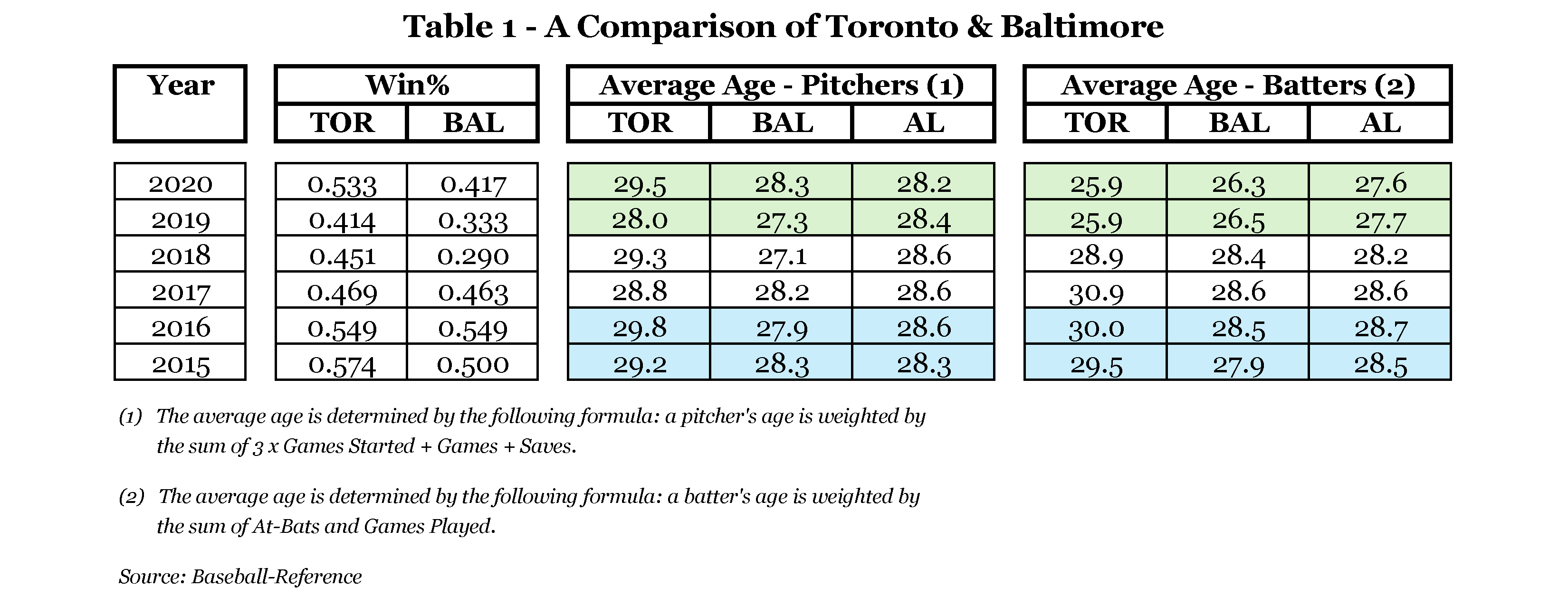 Table 1 shows Toronto’s and Baltimore’s winning percentages and average ages for the 2015-2020 seasons. Both teams struggled after the 2016 Wild Card Game.