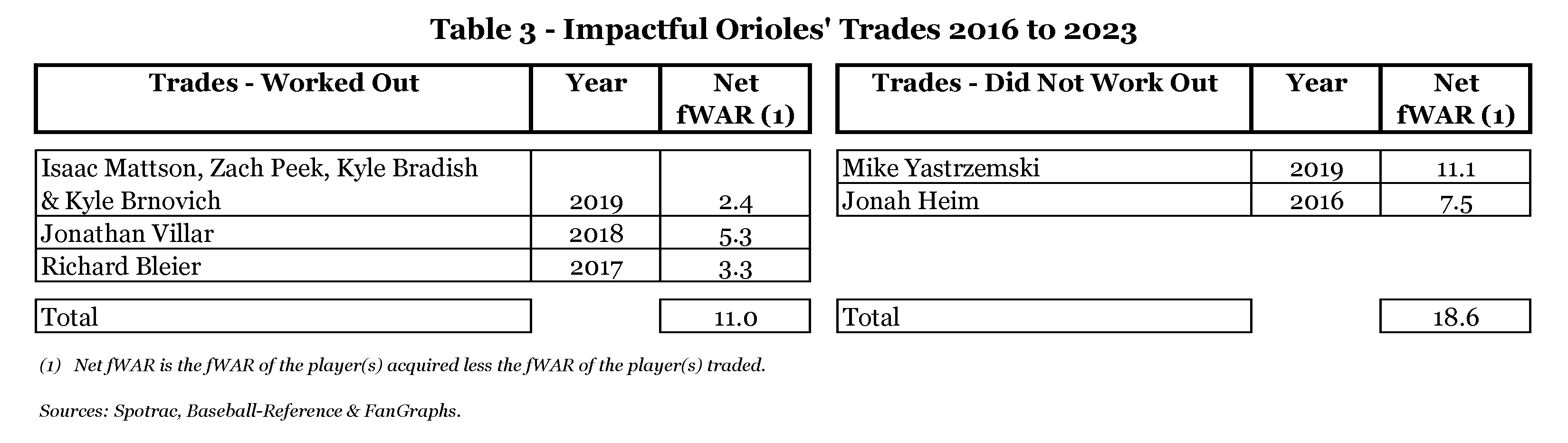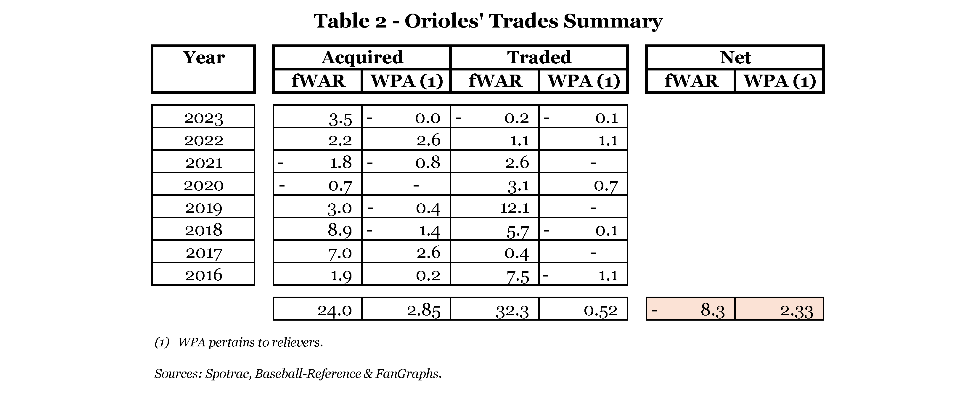Table 2 summarizes the trades executed by the Orioles during the 2016-2023 period, and Table 3 presents the more notable transactions.