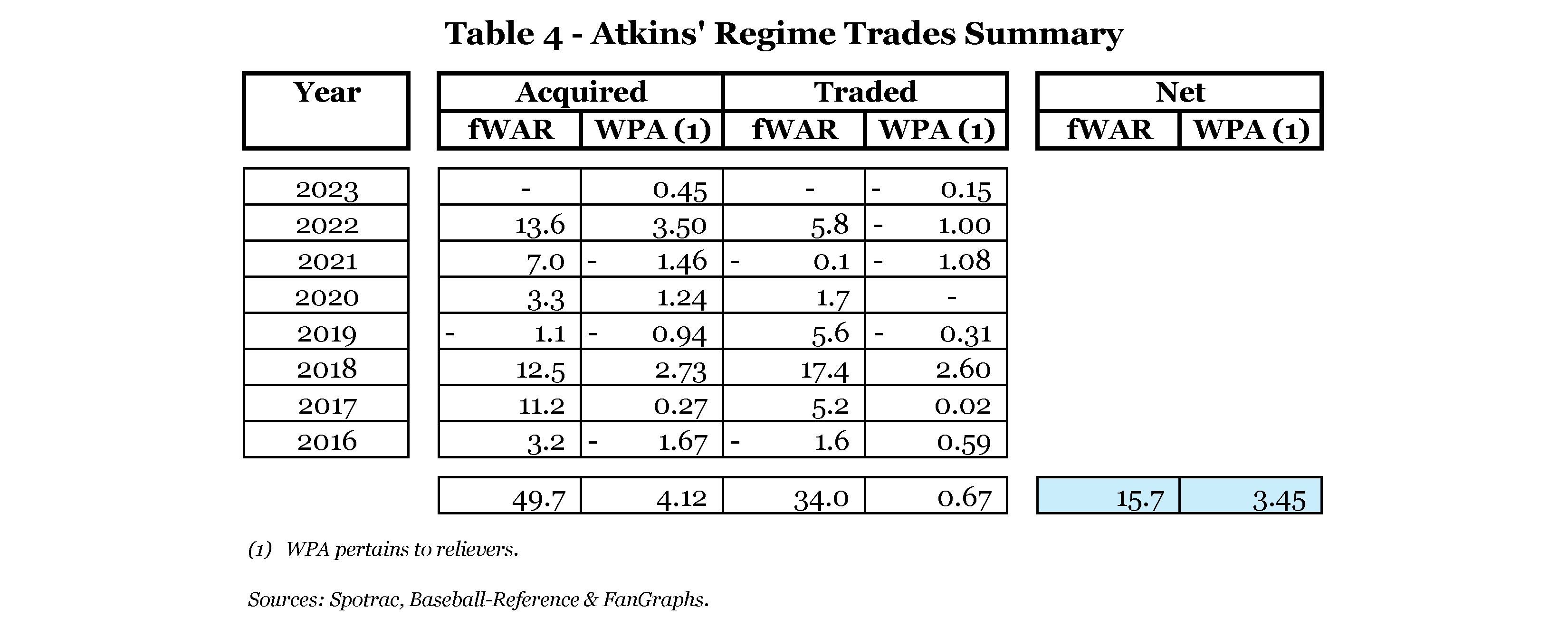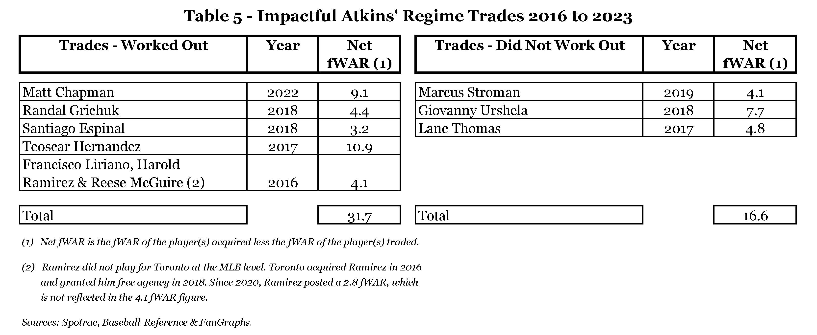 Under Atkins, the Toronto Blue Jays’ trades have worked out well. Please see Table 4.