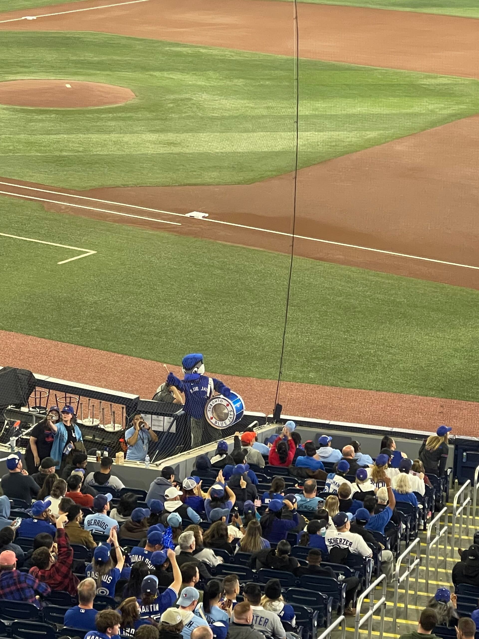The Jays’ mascot was stationed on the first base side of the field to watch the game, but also to guide the fans to cheer for the Blue Jays consistently and passionately. He stood on the field to signal to the crowd on what they should do to show their love for the Blue Jays. Not only did he walk, run and jump around to amp up the atmosphere, he also used a drum to get the occasional “Let’s Go Blue Jays” chant throughout the game.