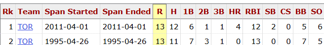 The Blue Jays had two Opening Day contests when they scored 13 runs, a 13-1 drubbing against the Oakland Athletics in 1995 and a 13-3 whipping of the Minnesota Twins in 2011.