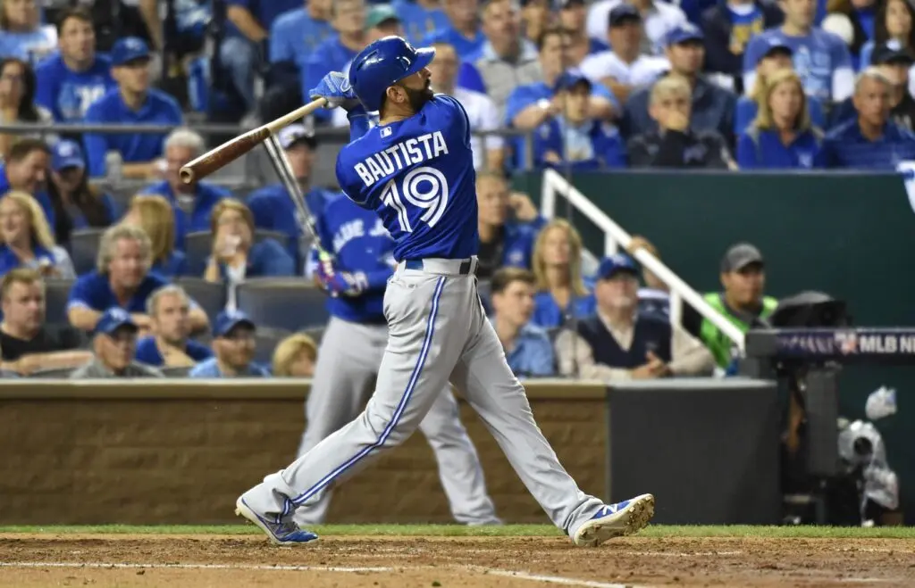 Oct 23, 2015; Kansas City, MO, USA; Toronto Blue Jays right fielder Jose Bautista hits a solo home run against the Kansas City Royals in the fourth inning in game six of the ALCS at Kauffman Stadium. Mandatory Credit: Peter G. Aiken-USA TODAY Sports