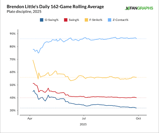 Hitters were swinging at pitches outside the zone against Little roughly 45% of the time in April, but by October, that number had dropped to around 30%. Their overall swing percentage declined from above 50% to 40%, yet they actually made more contact when swinging at the pitches he did throw in the strike zone. Further exacerbating this was that Little’s first-pitch strike percentage declined considerably over the course of the season.