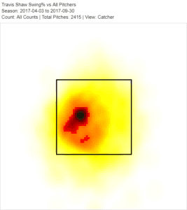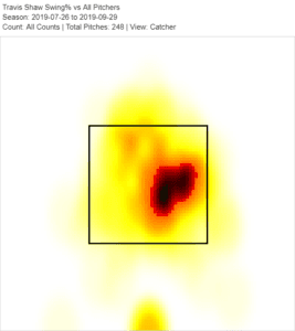 For the first half of the season everything for Shaw looked relatively the same. His launch angle was a few degrees higher and he hit a few more flies but nothing out of the ordinary. And then bam after coming back from the minors, Shaw was up there trying to golf everything into the seats. Shaw was also clearly looking middle in for pitches he could drive, something he didn’t do in years prior.