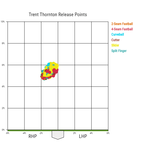 Look at Thornton’s release points again. There is plenty of yellow and blue near the top, indicating breaking ball and pink much lower for the fastball. It’s a subtle difference but one major league hitters can certainly pick up. The results speak for themselves. Batters had a 140 wRC+ against Thornton’s fastball.