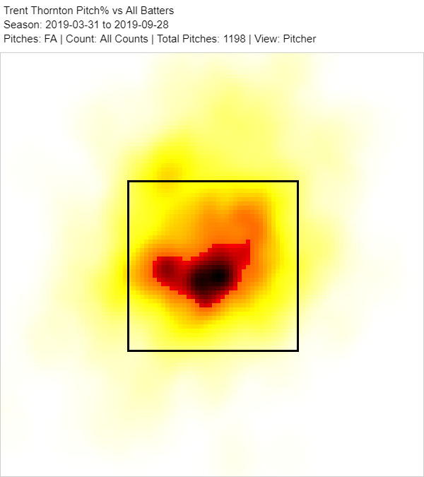 Thorntons’s four-seamer averages 92.9 mph and spins at 2373 rpm per Baseball Savant, giving him a Bauer Unit (RPM/MPH) of 25.5, which is above the MLB average of 24. This means that Thornton because he has slightly below average velocity but slightly above average spin, should be pitching up in the zone more.
