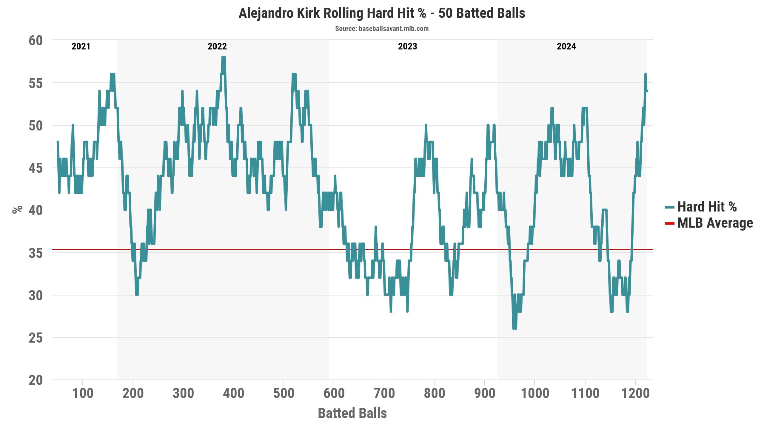 Even before hitting his stride in early August, Kirk had displayed signs of being close to a breakout dating back to as early as June — even though his traditional results suggested otherwise. He received encouraging spikes involving his balls-in-play output and quality-of-contact metrics, playing integral roles in his eventual offensive resurgence that arrived a few months later.