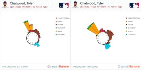 Using Baseball Savant’s Spin Mirroring tool, we can see that Chatwood’s cutter pairs well with his sinker.