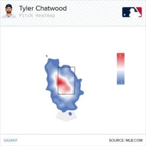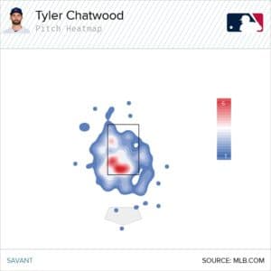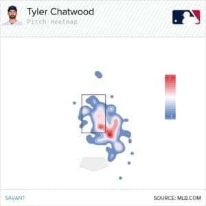 Sinkers are designed to be thrown low in the zone, but this is not it. That is right in a batters wheelhouse and with launch angles and hitters swinging up at everything it’s a wonder this pitch never got crushed for a homer. Now compare that to the location in 2019, when Chatwood’s sinker was his best pitch.