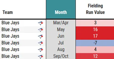 That production fell off in July, plummeting to a season-worst minus-seven FRV. But the club’s defenders finished strong down the stretch, earning an MLB-best plus-12 rating in September.