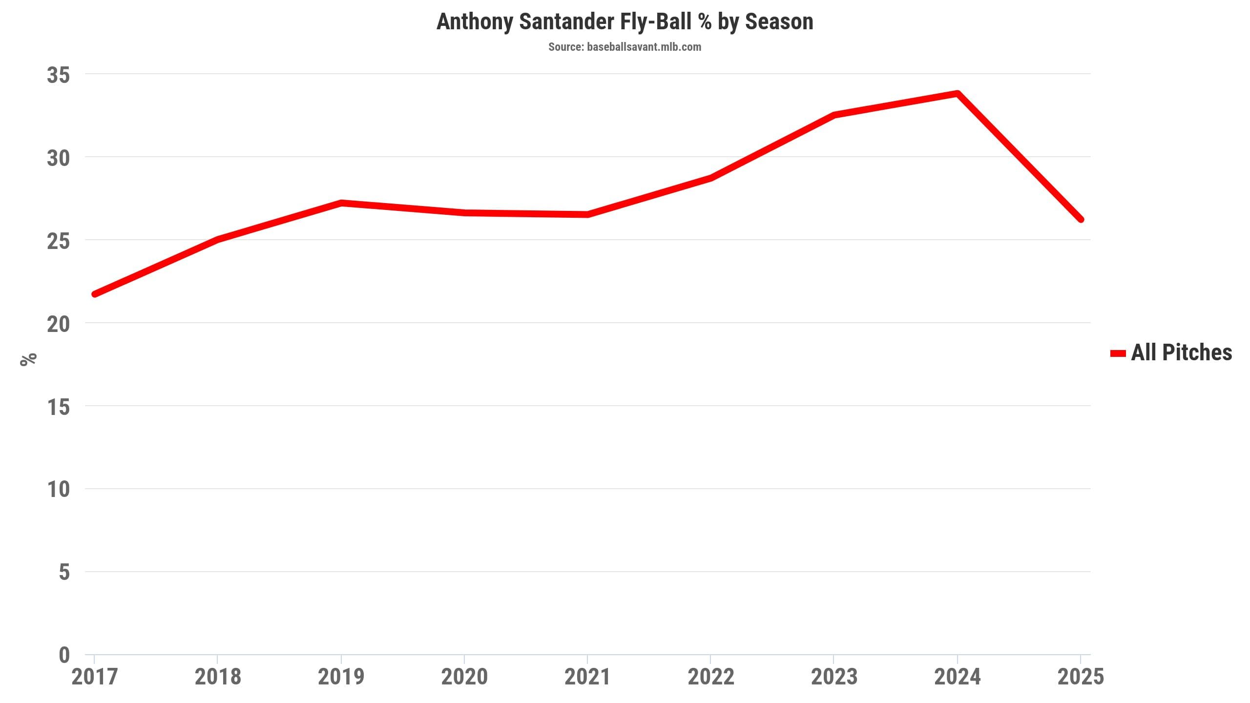 While Santander had been pulling balls at a higher clip than he ever had previously, producing a career-high 30.8-per-cent pull air rate, nearly three per cent higher than ’24, it wasn’t enough to overcome his increased ground-ball output.
