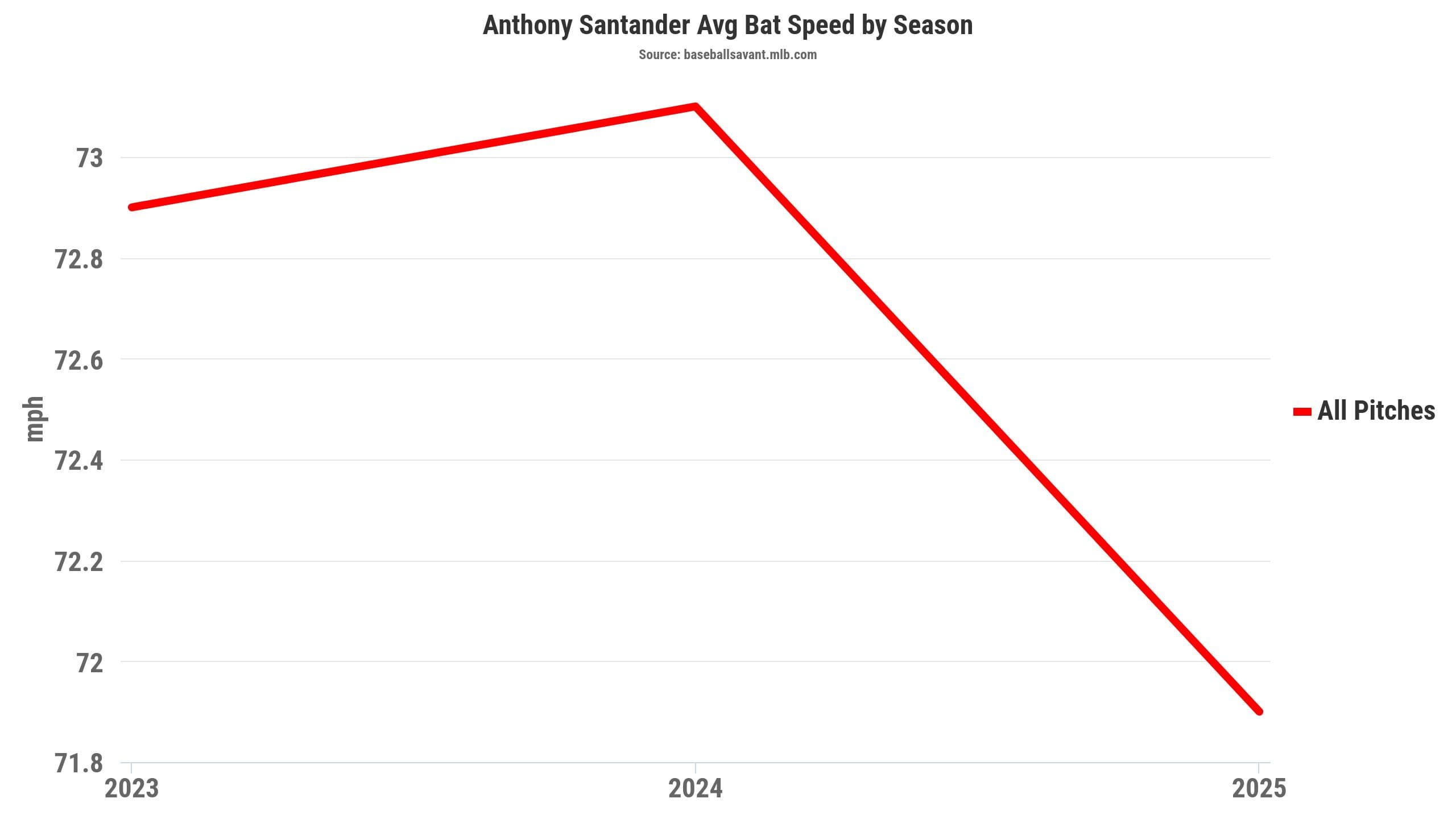 Nobody should be expecting Santander to enter Vladimir Guerrero Jr. or Addison Barger territory in this regard. That’s not his game, as evidenced by his 69th percentile average bat speed from a season ago. However, swinging hard is typically conducive to hitting for power. So, if he can take a step forward compared to his earlier readings this season, it may present a pathway to starting strong for the notoriously slow starter.