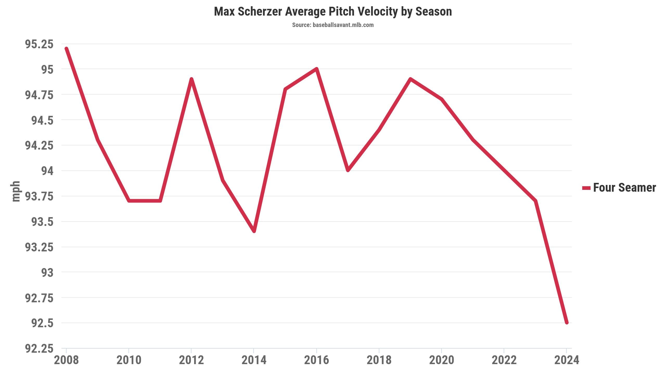 From an overall perspective, Scherzer’s underlying pitch qualities fully support the notion of his declining performance in recent years. It has been a steady downward trend, which began well before his injury-plagued 2024 campaign.