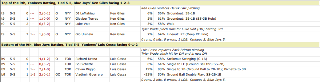 In the 10th inning, the Yankees trotted out Didi Gregorius, Cameron Maybin and Brent Gardner. The Jays countered with Justin Smoak, Randal Grichuk, and Reese McGuire. Gregorius walked, Maybin grounded into a fielders’ choice, and was then caught stealing before Gardner grounded out. Meanwhile, all three Blue Jays failed to reach base.