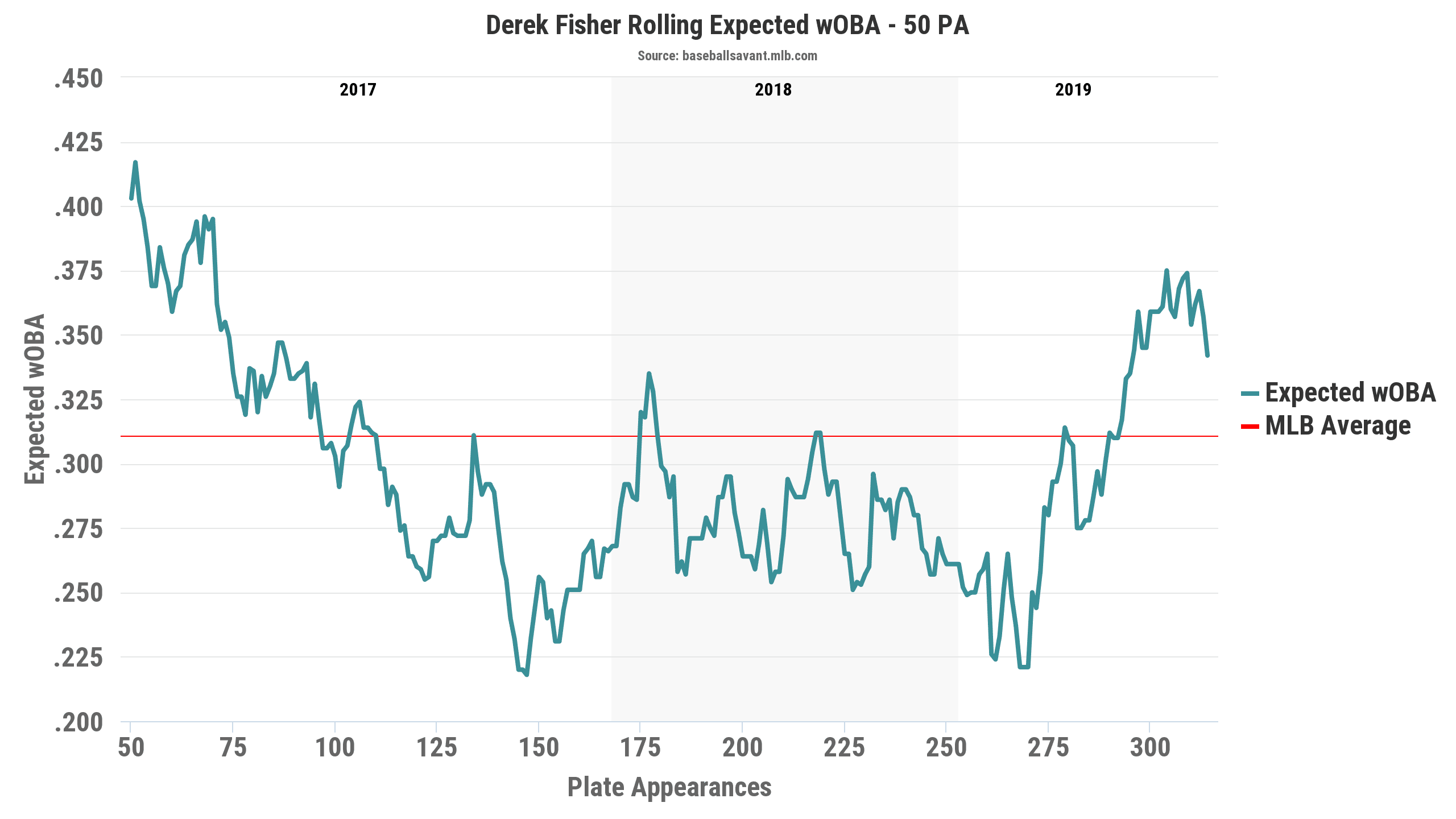 Looking at his entire MLB career in one fell swoop, Fisher has clearly been on a rollercoaster ride of expected wOBA and is just coming off of some of his best performances. Through it all, he has generally averaged out to be an average hitter but there might be more to work with.
