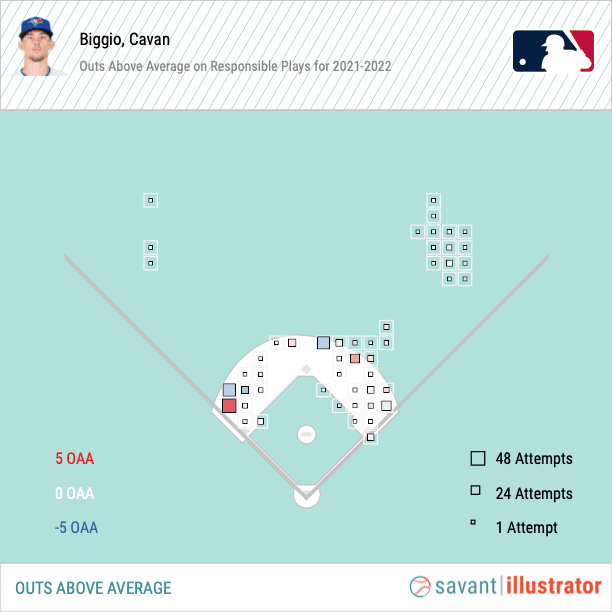 At this point in his career, you know what Cavan Biggio will give you on defence. He plays a lot of positions solidly, even if he’s not always fantastic at any one. He’s still naturally a second baseman, and a move back to primarily 2B worked wonders for him in 2022. He racked up 7 OAA as a second baseman in 115 attempts, also tacking on another OAA in right field, in just 16 attempts. This plot displays Biggio’s average starting position in 2021 and 2022.