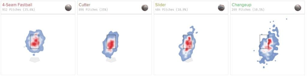 That is too much red right over the heart of the plate not just on the fastball but for all of his pitches (minus the change-up). When you see this it’s no wonder Kikuchi had a 20.6% home run to fly ball rate, the second highest rate among pitchers who threw 140 innings. Even in a ballpark like T-Mobile Park in Seattle, that many pitches over the heart of the plate is going to lead to balls leaving the yard. For a pitcher who threw that many strikes it’s unsettling to see him also have a 9.3% walk rate. You can’t be walking batters and giving up loud contact, that’s a recipe for big innings and short outings.