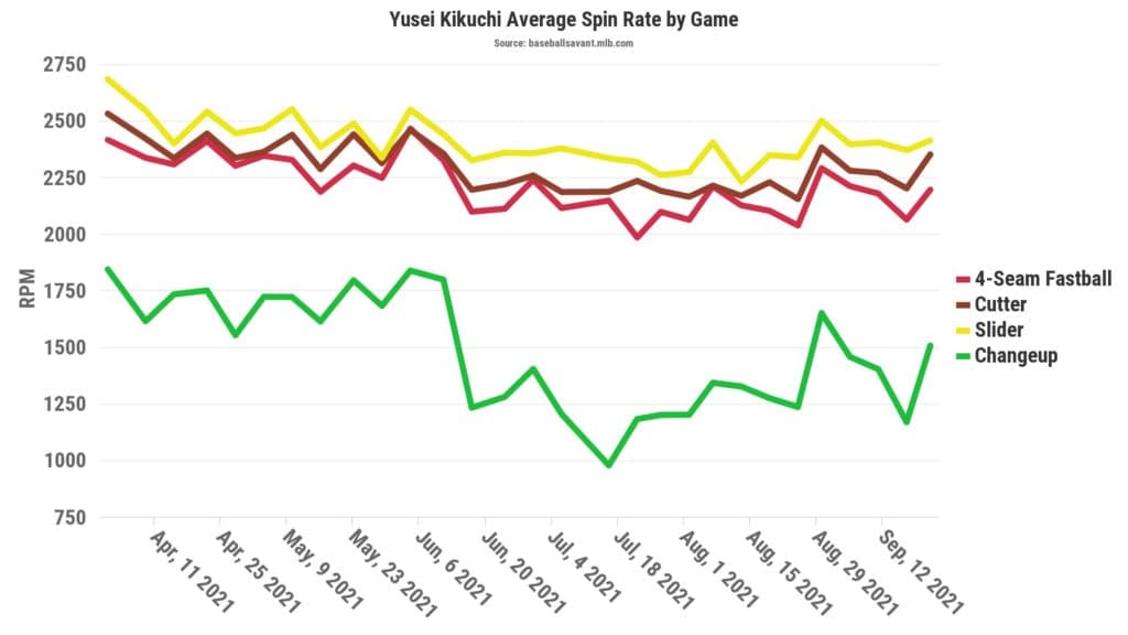 What can Kikuchi do to fix this? Back in May, Michael Ajeto of Lookout Landing suggested Kikuchi could use his best pitch a lot better. Ajeto noted that Kikuchi was leading the league in ball percentage thrown with his fastball, and that his slider is his best pitch, provided he could throw it down and out of the strike zone. Kikuchi was able to throw more strikes with his fastball, however, I don’t think anyone wants him throwing it right down the middle. Kikuchi did make a pitch mix change throughout the season, though it was the opposite of what Ajeto suggested. Kikuchi increased his fastball usage up to 40% at the expense of his cutter and slider. This pitch mix change was likely due to the fact that Kikuchi saw a noticeable decline in spin rate on all of his pitches after the sticky stuff crackdown in June.