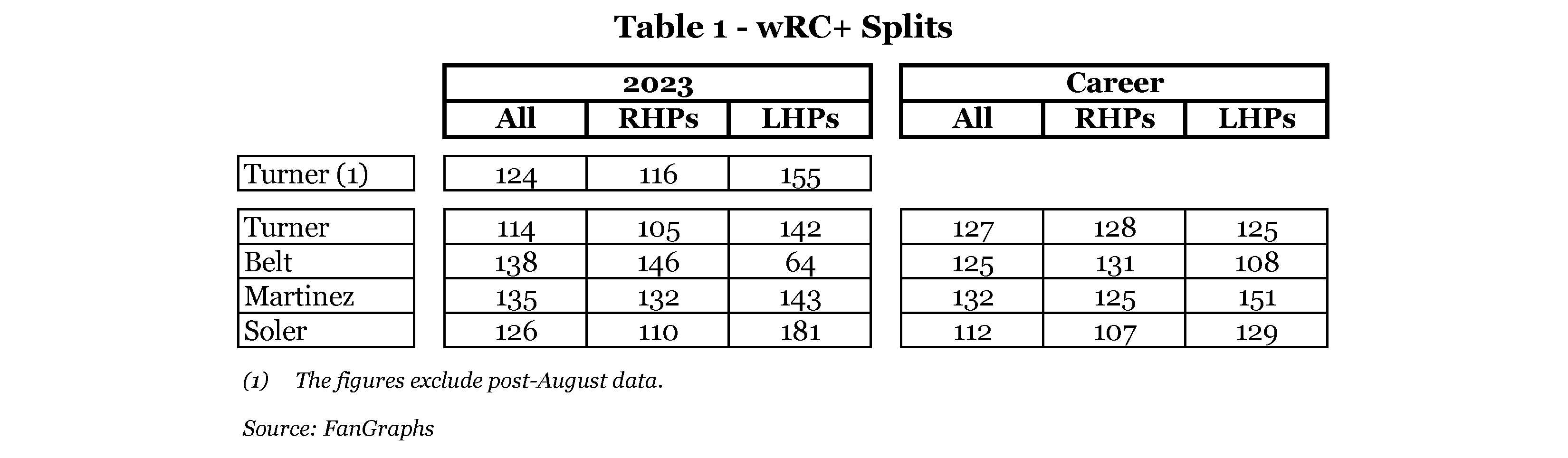 Beginning with his tenure with the Dodgers, Turner has performed very well at the plate. His career 127 wRC+ and balanced production versus righthanded pitchers and lefties is noteworthy. However, Martinez was more formidable than Turner in 2023, and his career 151 wRC+ versus lefthanded pitchers is terrific.