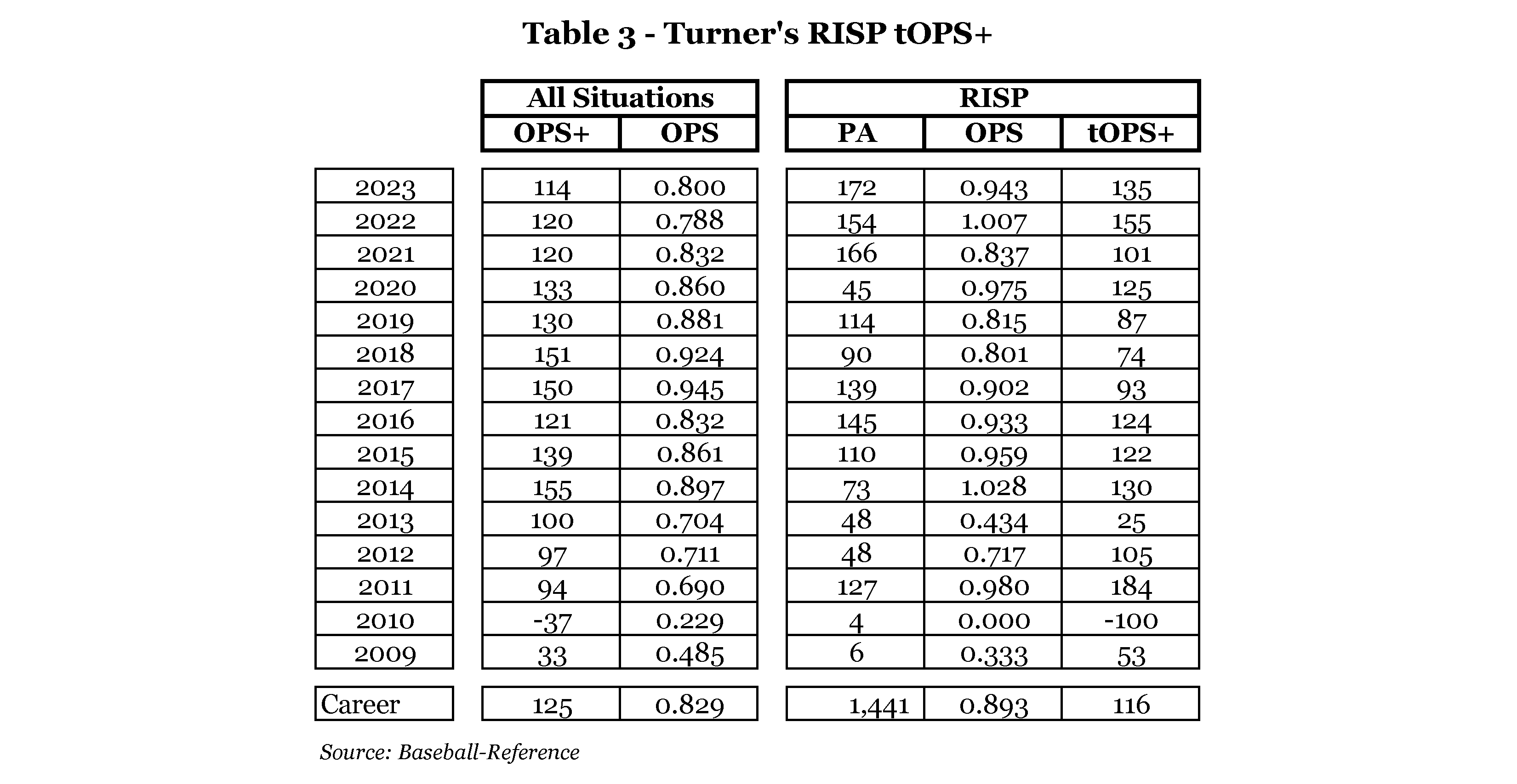 What to make of these numbers? Since his Dodger days began (2014), Turner has had three seasons where his tOPS+ was below 100 and seven where his tOPS+ exceeded 100. Therefore, the tOPS+ season-to-season variability supports the view that past RISP performance does not predict future RISP performance. Hence, we cannot be confident that Turner’s 2024 RISP OPS will exceed his overall 2024 OPS. However, given his career 116 RISP tOPS+, we should not be surprised if Turner outperforms his 2024 OPS in RISP situations next season.