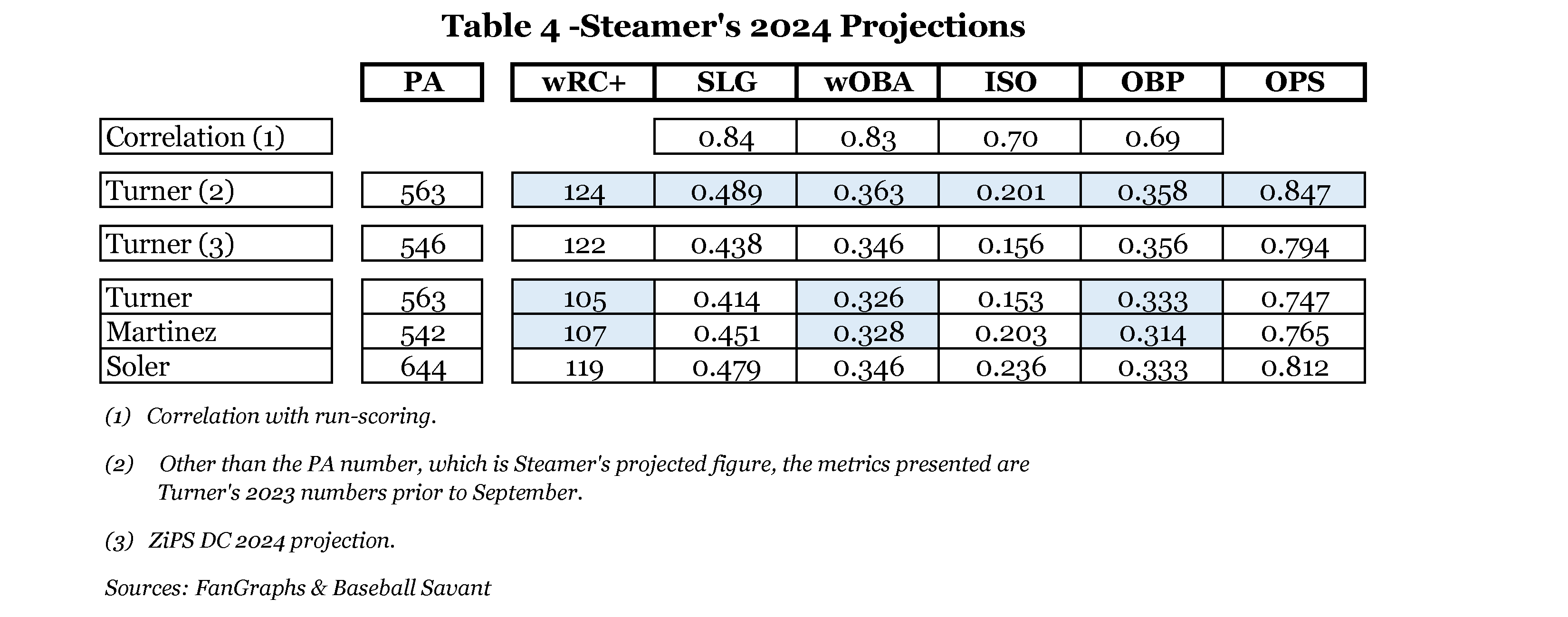 I present Table 4, Steamer’s 2024 projections for Turner, Martinez and Soler. The highlights are as follows: