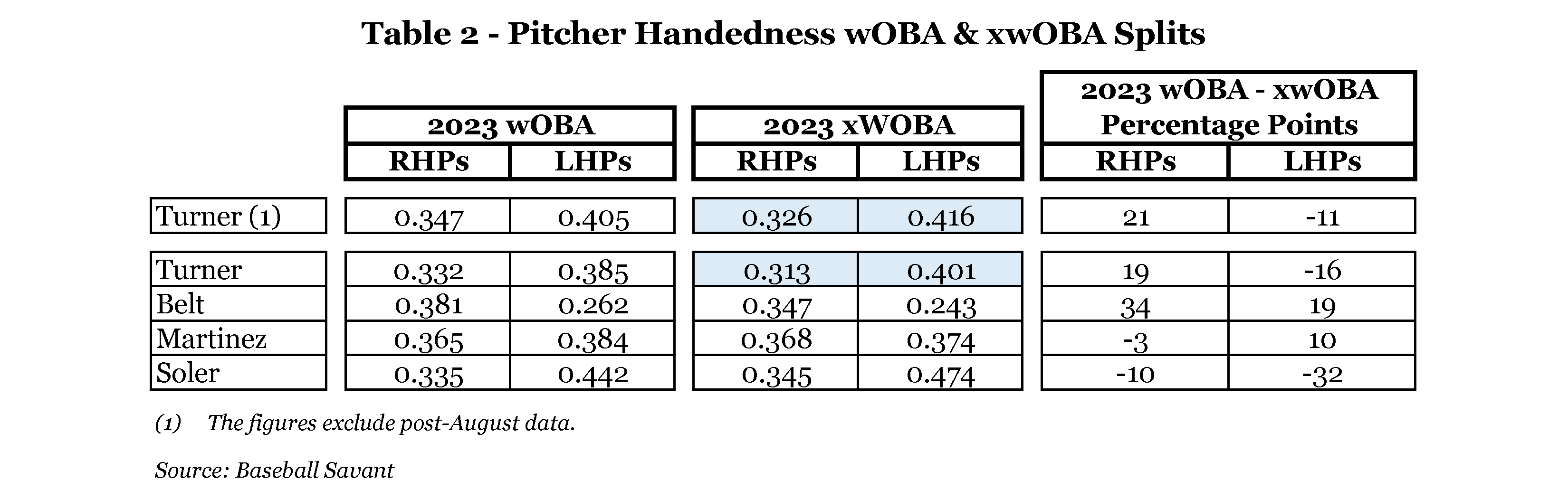 Therefore, Turner’s 2023 batting metrics, particularly the numbers adjusted to account for the heel injury, bode well for 2024.