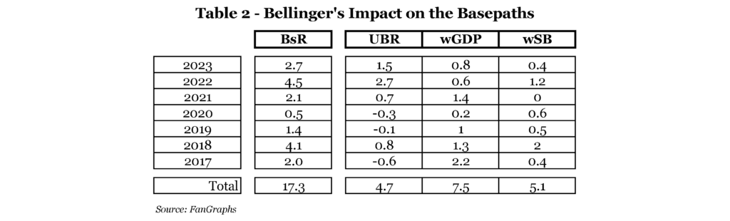 Table 2 concerns BsR, the sum of UBR, wSB and wGDP. Bellinger runs the bases well, steals bases judiciously (20 of 26 attempts in 2023, 80 of 102 in his career), and grounds into double plays at a rate lower than the MLB average.