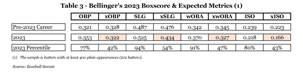 There were significant differences between Bellinger’s box score and expected stats. For example, Bellinger’s 0.525 SLG was 94th percentile. However, his xSLG was in the 54th percentile, slightly better than the middle-of-the-pack hitter. The story is similar for OBP, wOBA and ISO. These box score figures ranked well in 2023. Conversely, Bellinger’s xOBP, xwOBA and xISO stats were below the median.