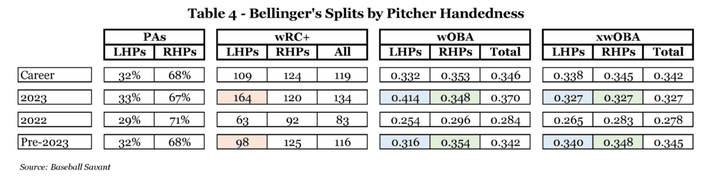 Table 4 shows that in 2023, Bellinger posted a remarkable 164 wRC+ versus lefthanded pitchers. That mark far exceeded his 98 wRC+ career number before the 2023 season. Do I believe Bellinger will likely produce a 164 wRC+ and a 0.414 wOBA in 2024? No, but he can generate a wOBA higher than his 0.332 career mark. Why?