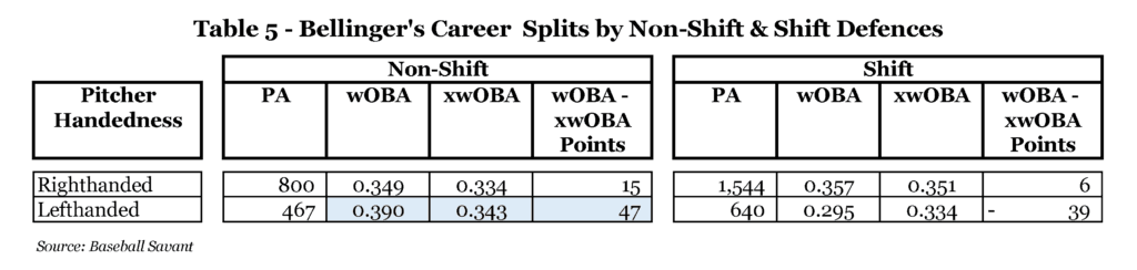Please take a look at Table 5. During his career against lefties, Bellinger produced a 0.390 wOBA in non-shift situations, 47 points higher than his xwOBA. Before 2023, Bellinger’s career wOBA against lefthanded pitchers in non-shift situations was 0.370, which exceeded his 0.351 xwOBA.