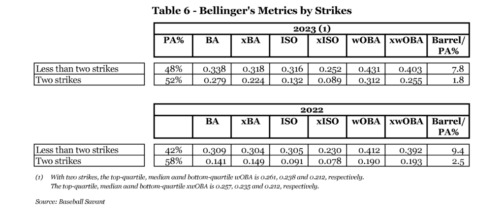 Consider Table 6 for more data concerning Bellinger’s performance by strike number. Bellinger’s 2023 numbers with less than two strikes are slightly better than 2022. With two strikes, Bellinger’s 2023 BA, ISO and wOBA stats are noticeably better than in 2022. With two strikes, Bellinger’s 2023 wOBA percentile ranking was 98th, and his xwOBA was 72nd.