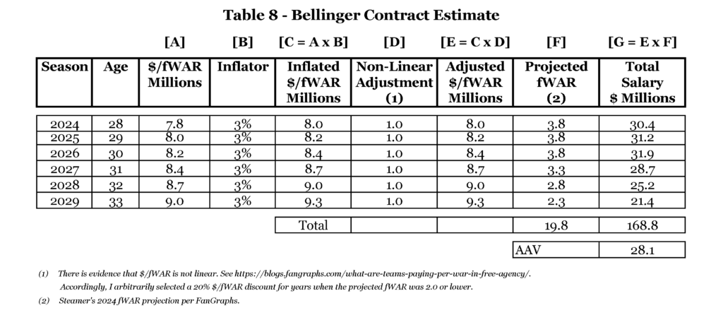 Table 8 shows my estimate for a six-year contract. For this projection, I used the inputs from Scenario C. If I used the numbers from Scenario B (Steamer’s 2024 performance estimates), the corresponding deal is six years, USD 96.6 million.