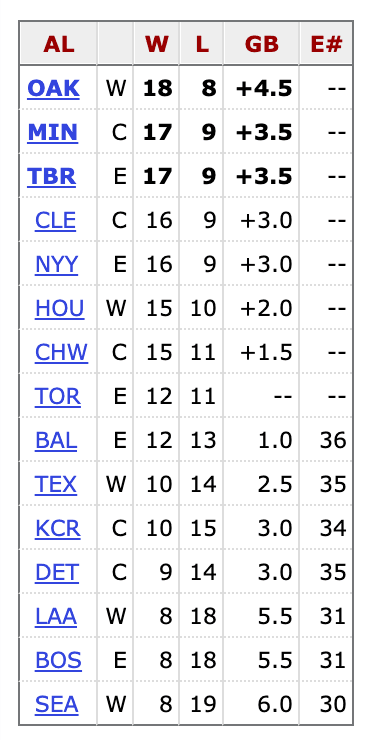 Elsewhere, a very clear picture of the playoff race in the American League is forming around them. While the National League is a total crapshoot in which anybody (save for the 4-17 Pirates) can realistically make it to the dance, the AL features a top group and a bottom group.