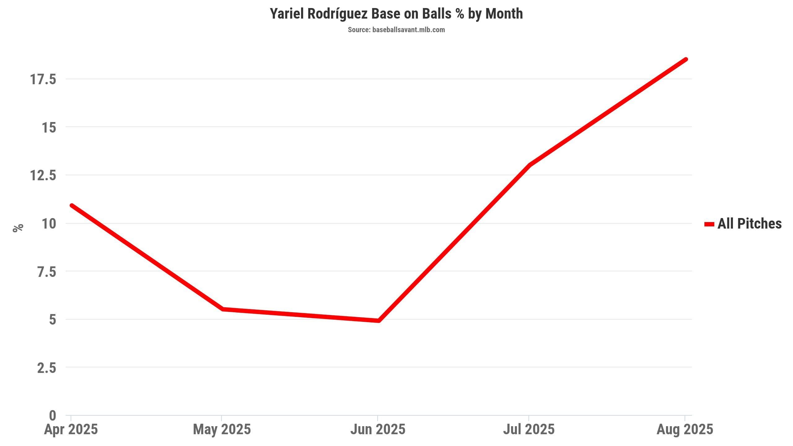 That Jekyll-and-Hyde sentiment can also apply to Rodríguez, who’s seen his whiff rate climb into elite territory (31 per cent clip in June and August) while emerging as a high-leverage reliever, but has struggled to limit free passes in the second half.
