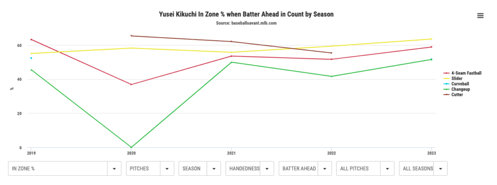 One of the most glaring issues in Kikuchi’s 2022 season was he was incapable of finding the zone with any sort of level of consistency, as seen here in this image.